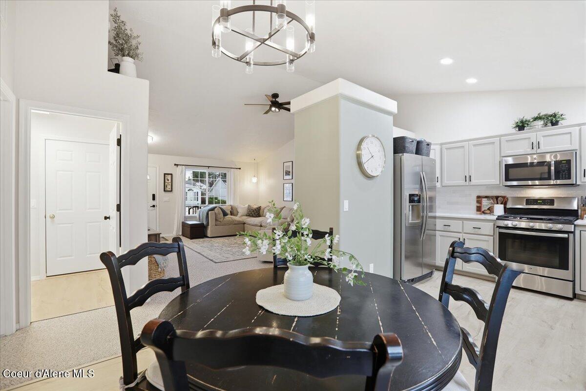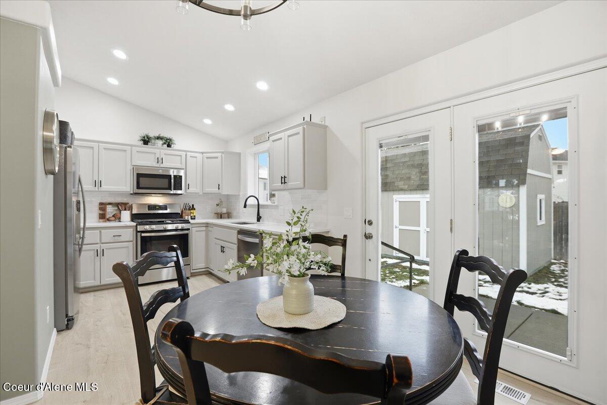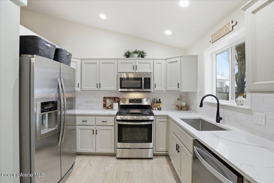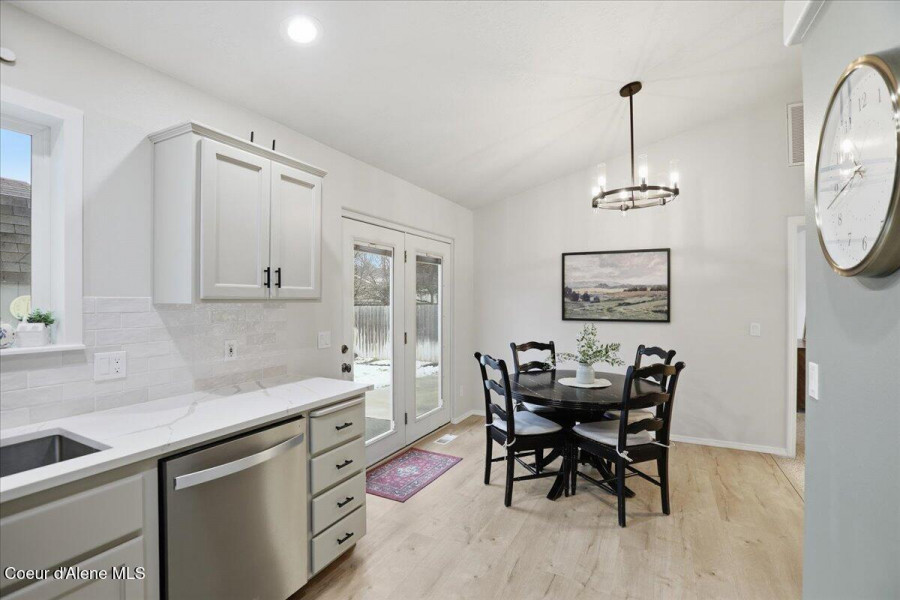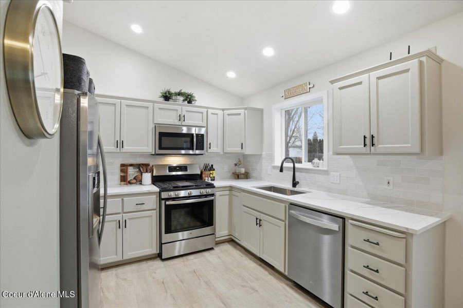 Come check out this beautifully updated single-level rancher, ideally situated in the north end of of Coeur d'Alene. This home boasts modern upgrades with an efficient layout-perfect for comfort, convenience, and everyday living. Inside you will find vaulted ceilings with carpet and LVP laminate flooring that flows throughout the home. The upgrades include; new interior paint, refinished bathroom vanities and fixtures, refinished kitchen cabinetry and new stainless steel kitchen appliances, which are all included. The dining room has French doors to the generous back patio and 10 x 20 storage/garden shed. The well-designed floor plan includes spacious bedrooms and a private primary suite, providing quiet separation and a relaxed atmosphere. Located just minutes from downtown, shopping, restaurants, parks, and Lake Coeur d'Alene, this home is a rare find in a highly sought-after neighborhood.