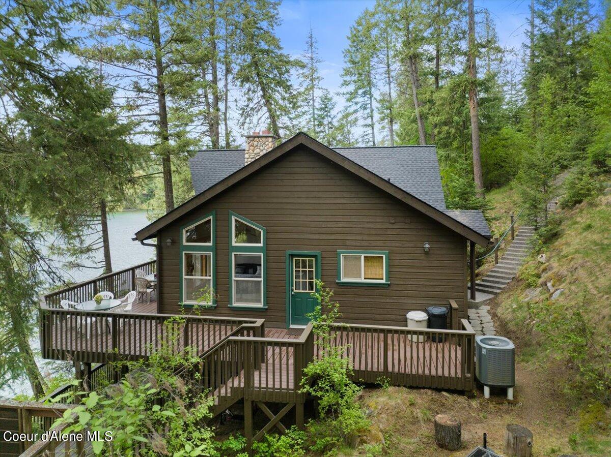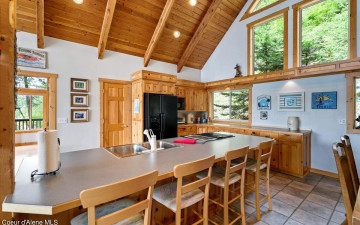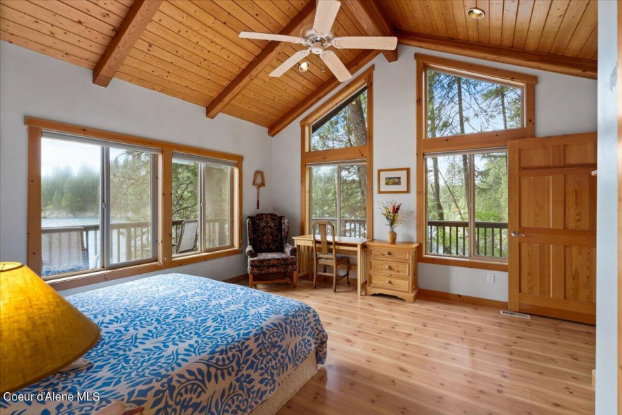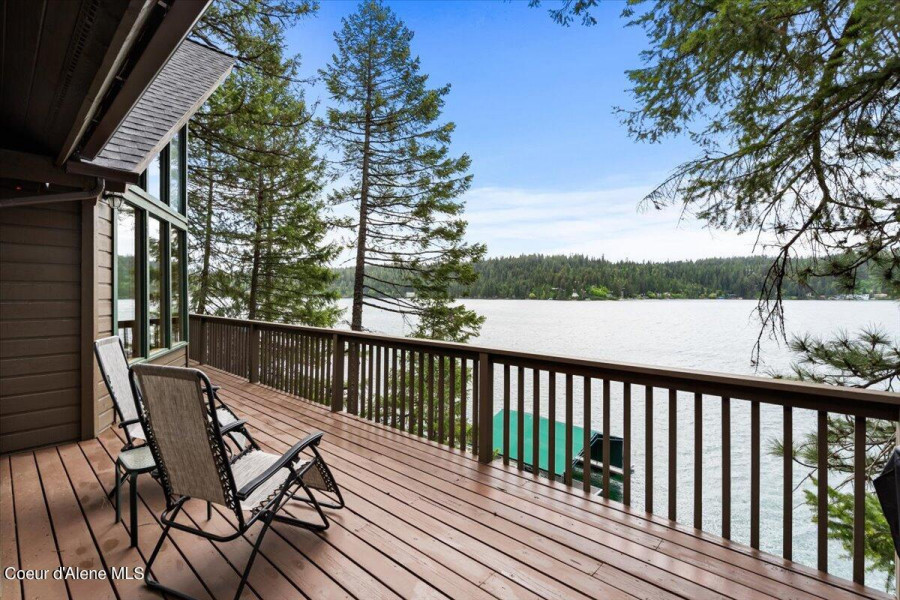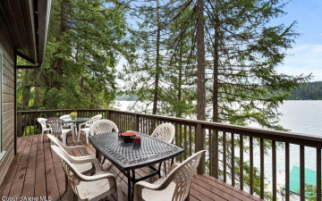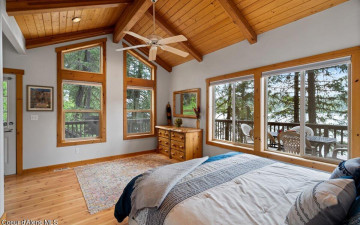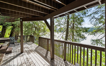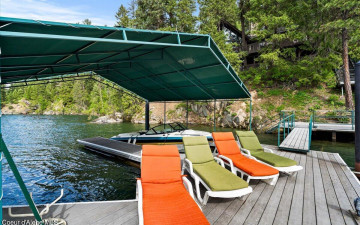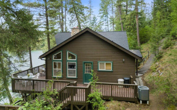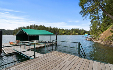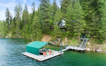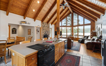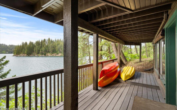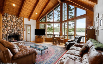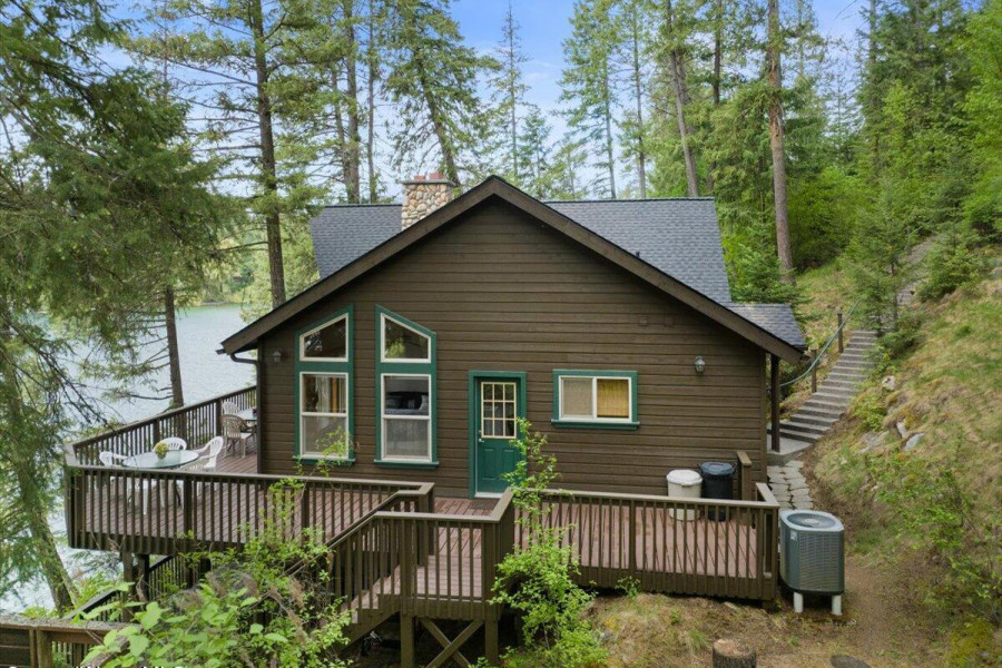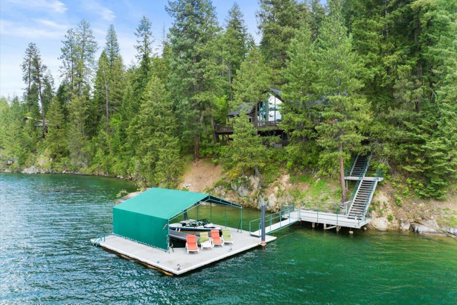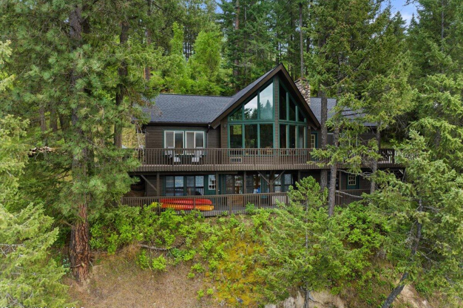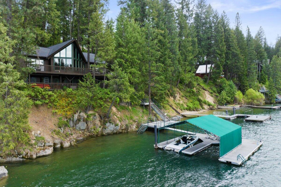 Spectacular Privacy & Comfort on Hayden Lake. Introducing the ultimate Hayden Lake waterfront cabin! Magnificent views. Incredible privacy. 100 ft of deep waterfront, with double-slip dock and steps to your own private swimming area. This beautifully maintained 2740 sf chalet-style home features sweeping views, expansive windows, cathedral ceilings, wood beams & stone fireplace. Two lakeside primary suites, each with full bath, are situated on the main level. The lower-level family/bunk room offers loads of sleeping options, as well as a 3rd full bath. The desirable western exposure ensures extended days lounging in the sun, enjoying endless recreation, relaxation & spectacular sunsets! Fully furnished & totally turnkey, including ski boat, kayaks, wakeboards, toys & tools galore!